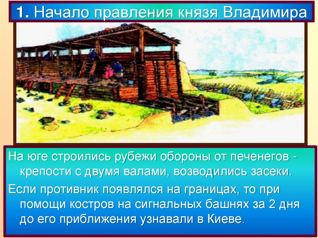 1. Начало правления князя ВладимираНа юге строились рубежи обороны от печенегов крепости с двумя валами, возводились засеки.