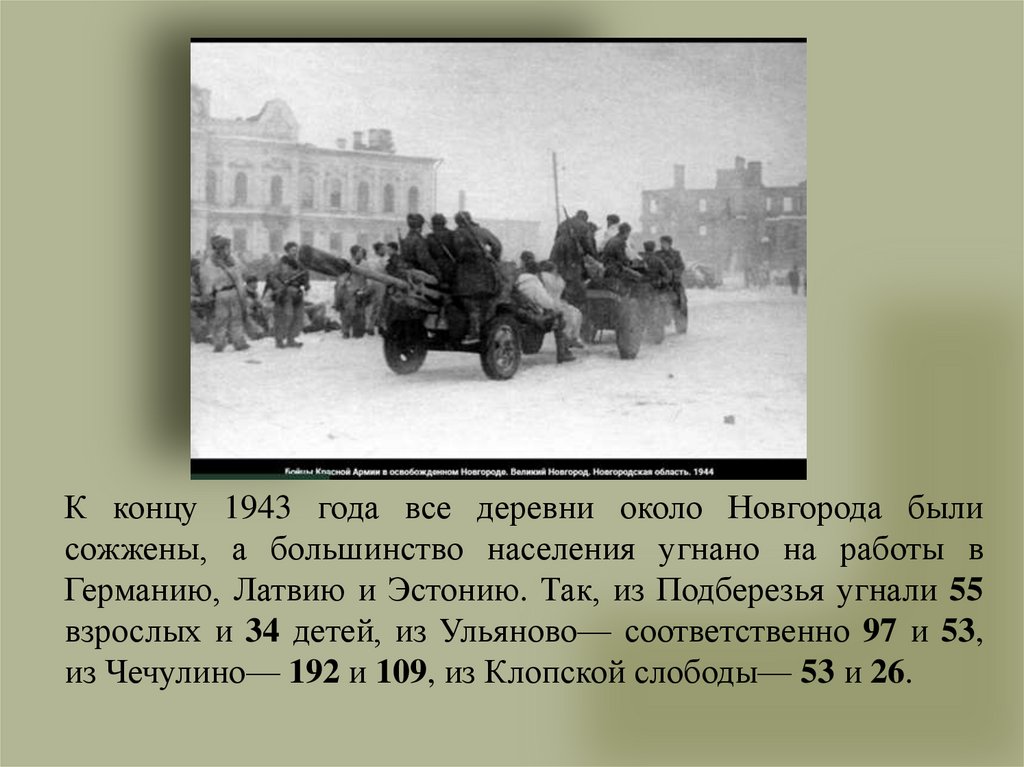 К концу 1943 года все деревни около Новгорода былисожжены, а большинство населения угнано на работы в