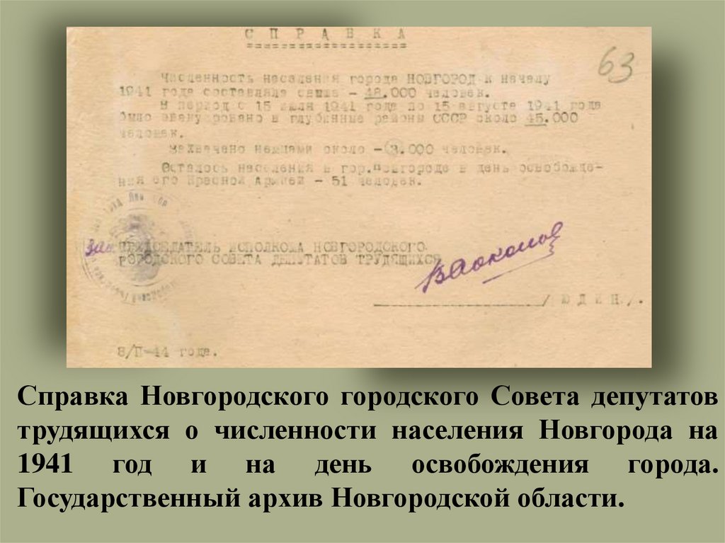 Справка Новгородского городского Совета депутатовтрудящихся о численности населения Новгорода на