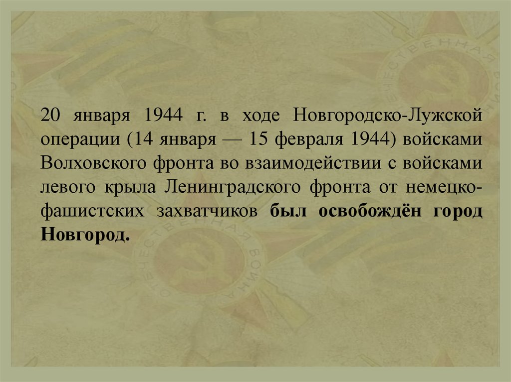 20 января 1944 г. в ходе Новгородско-Лужскойоперации (14 января — 15 февраля 1944) войсками