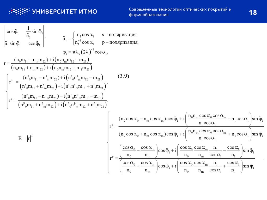 9. Спектральные зависимости энергетических коэффициентов отражения и пропускания слоя, показатель преломления которого лежит в
