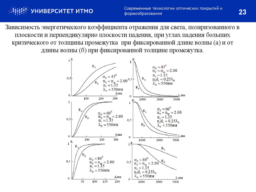 Зависимость энергетических коэффициентов отражения и пропускания от толщины слоя при