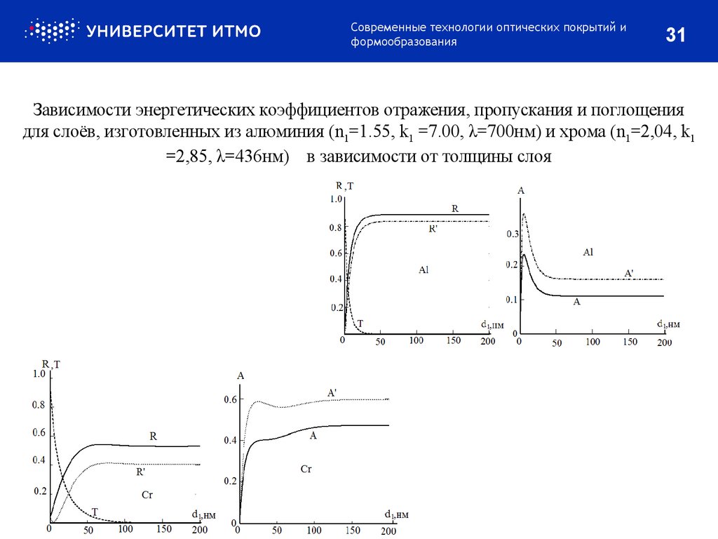 32. Зависимости энергетических коэффициентов отражения, пропускания и поглощения для слоёв, изготовленных из титана (n1=2,26, k1