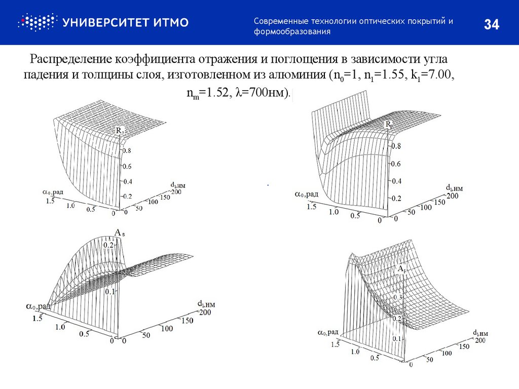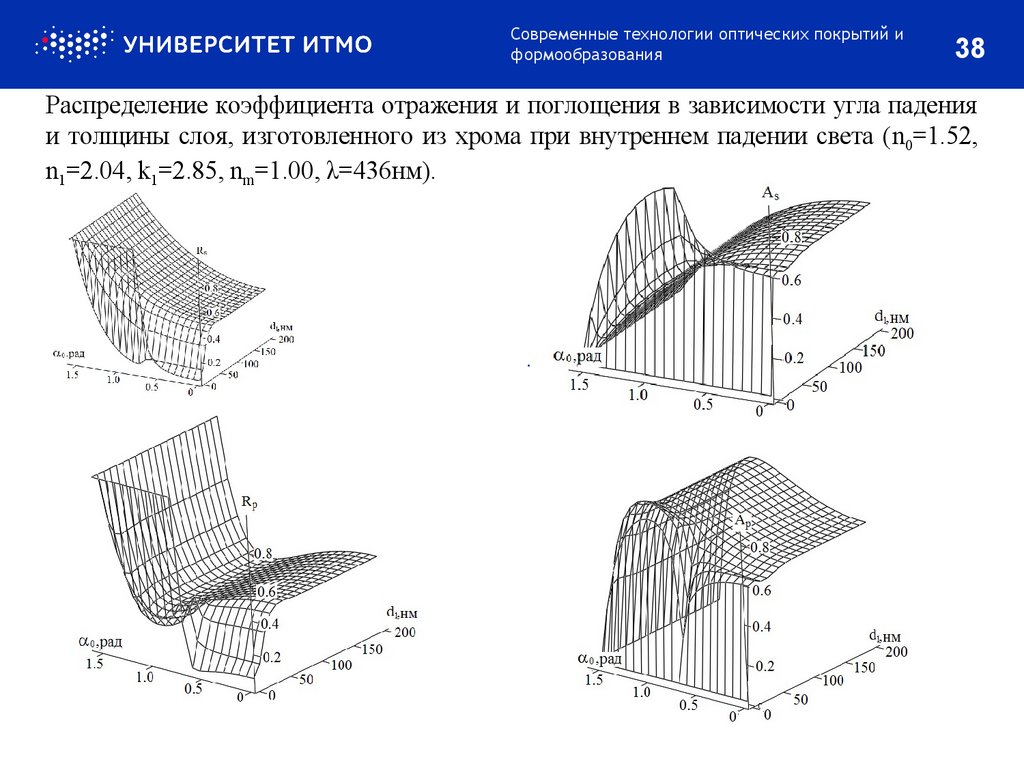 35. Распределение коэффициента отражения и поглощения в зависимости угла падения и толщины слоя, изготовленном из хрома, (n0=1,