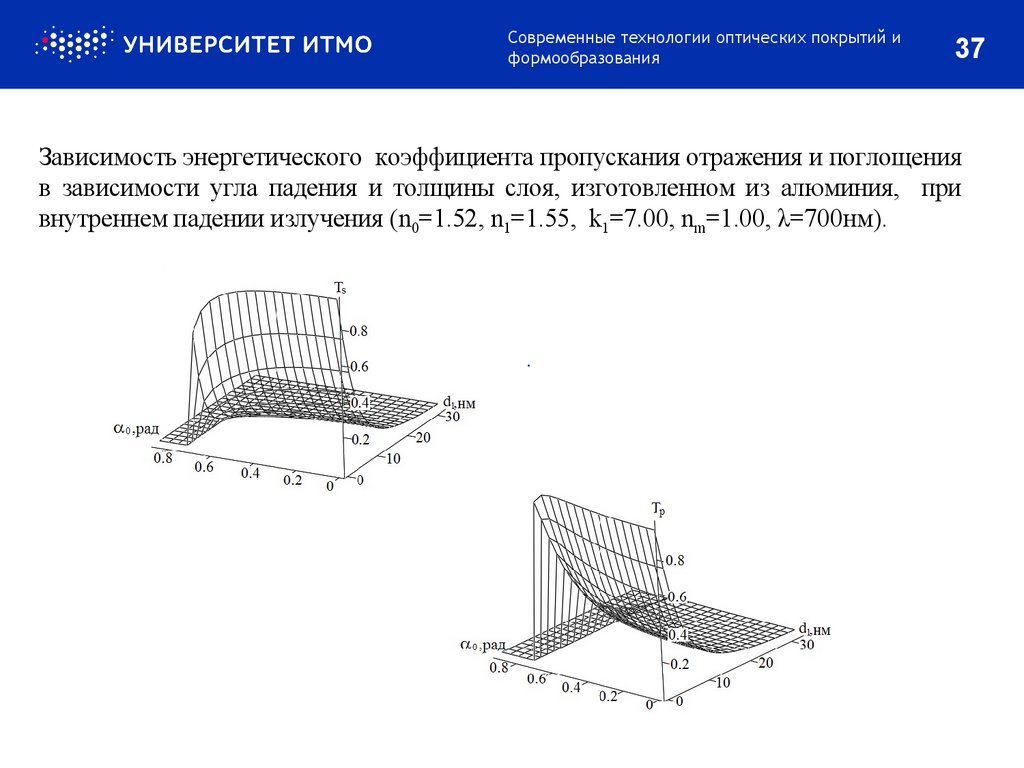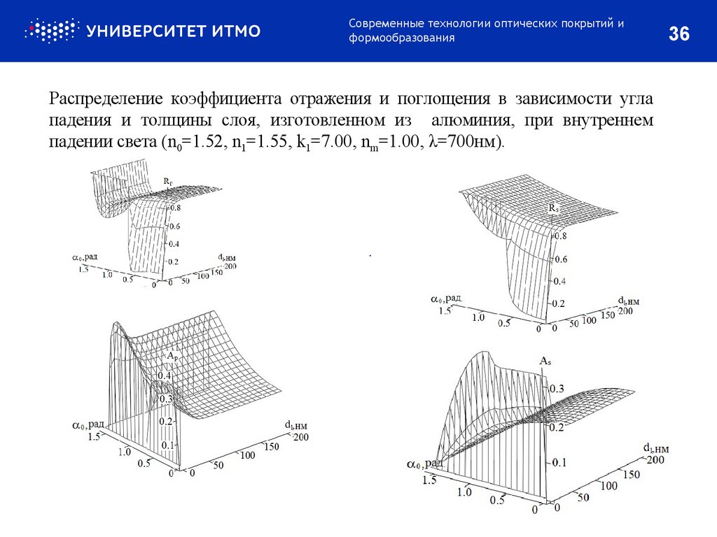 в зависимости угла падения и толщины слоя, изготовленном из алюминия, при