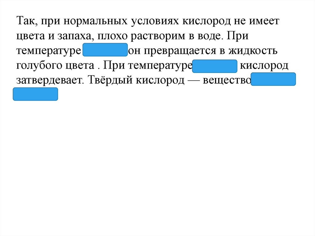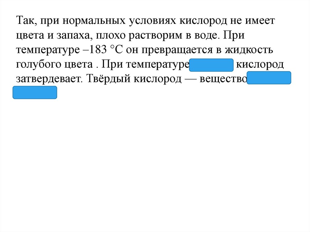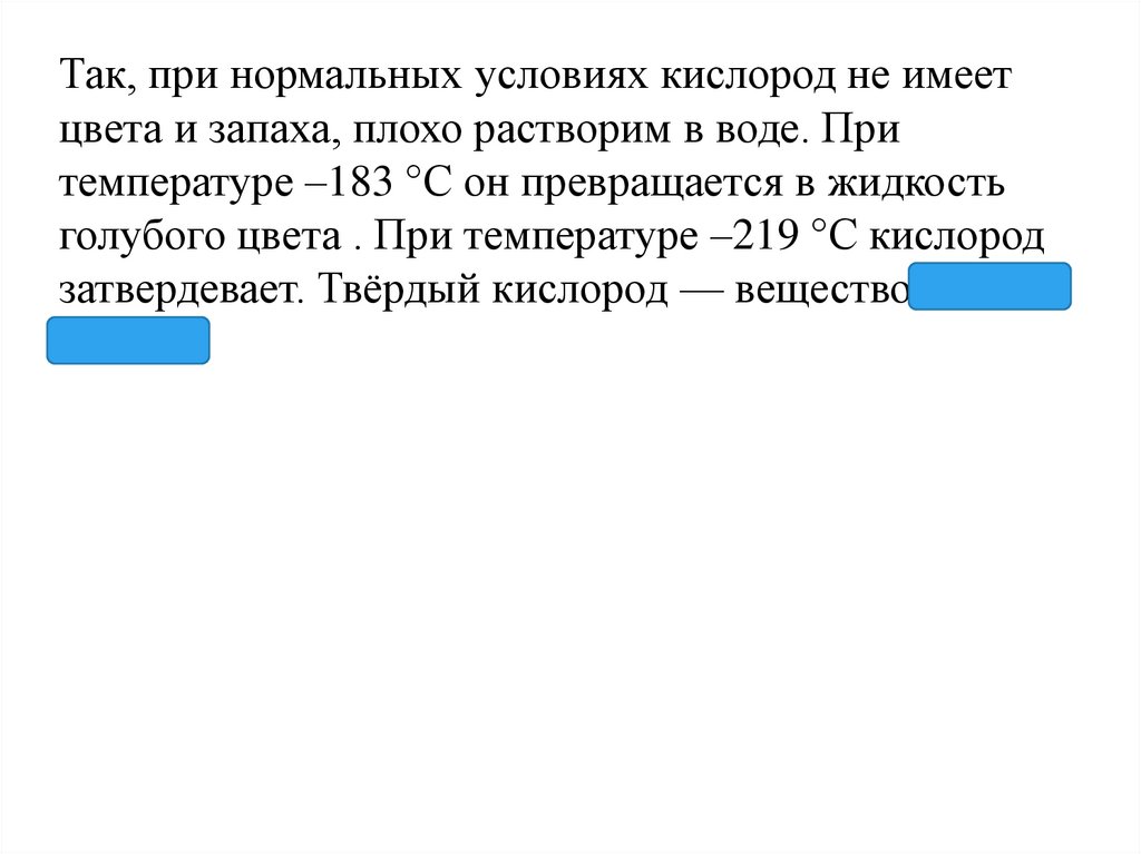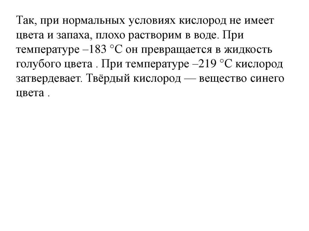 Так, при нормальных условиях кислород не имеетцвета и запаха, плохо растворим в воде. При