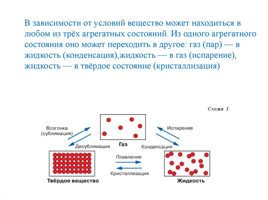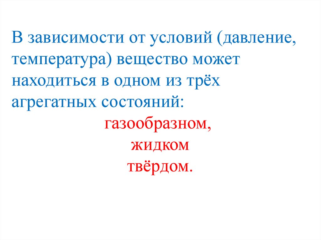 В зависимости от условий вещество может находиться влюбом из трёх агрегатных состояний. Из одного агрегатного