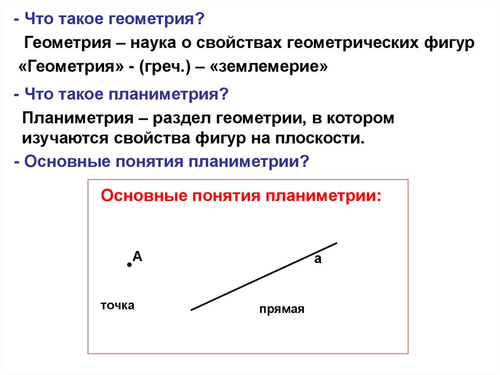 - Что такое геометрия?Геометрия – наука о свойствах геометрических фигур