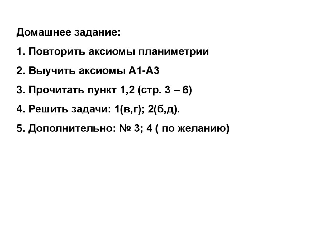 Домашнее задание:1. Повторить аксиомы планиметрии