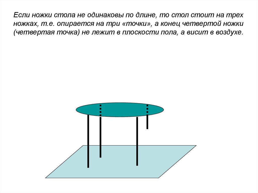 Если ножки стола не одинаковы по длине, то стол стоит на трехножках, т.е. опирается на три «точки», а конец четвертой ножки
