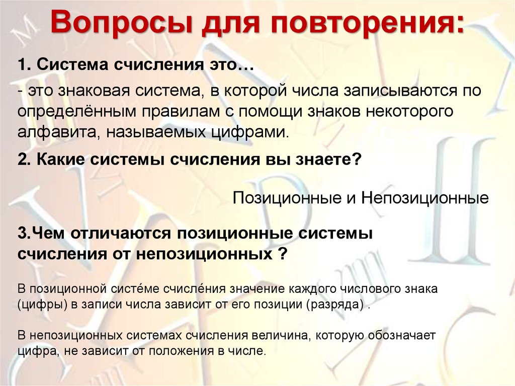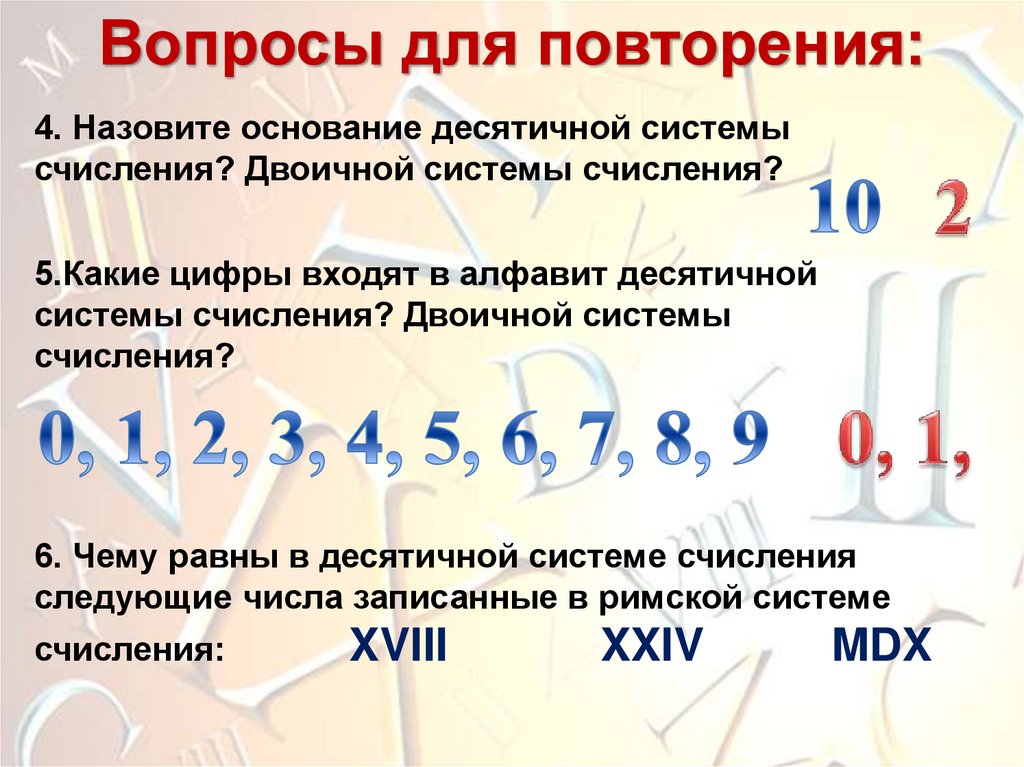 Вопросы для повторения:4. Назовите основание десятичной системы