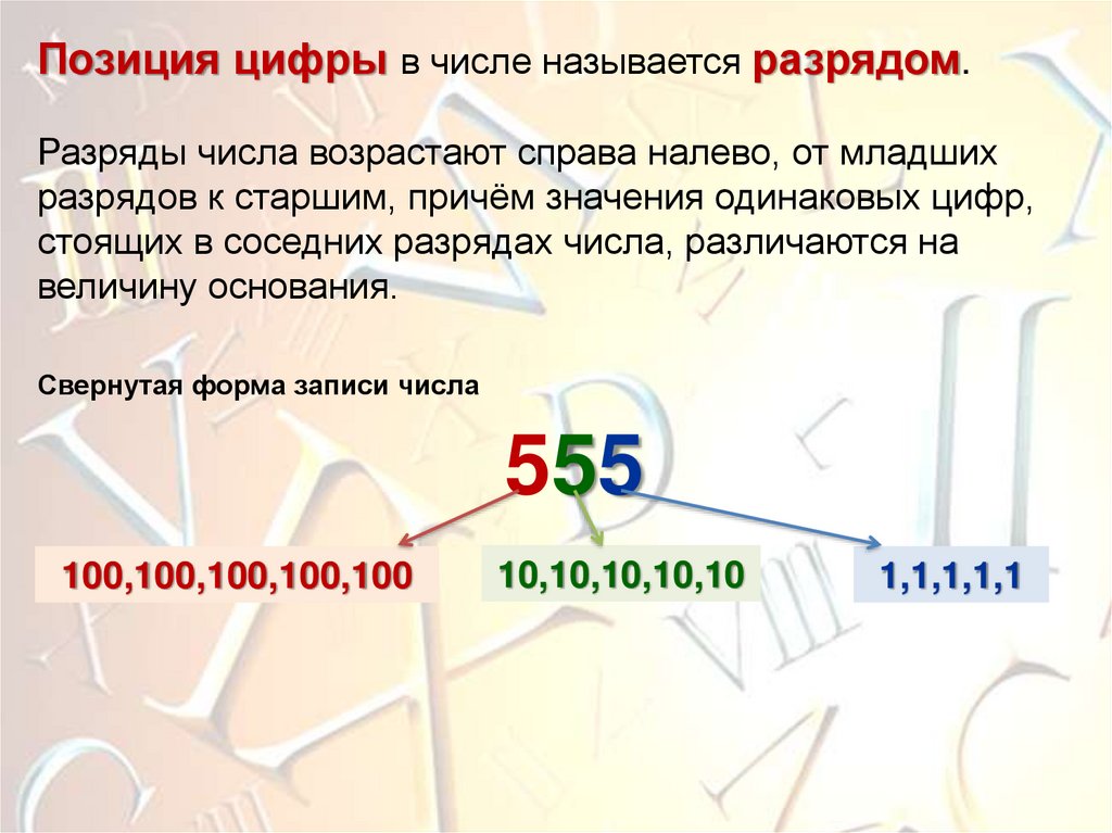Позиция цифры в числе называется разрядом.Разряды числа возрастают справа налево, от младших