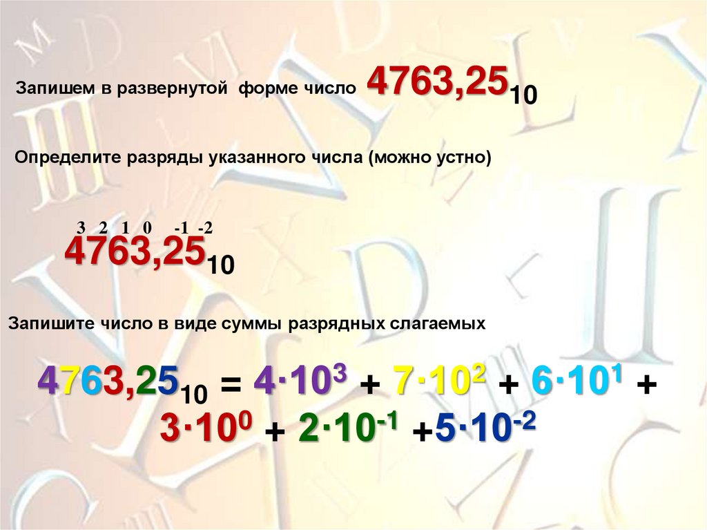 4763,2510 = 4·103 + 7·102 + 6·101 +