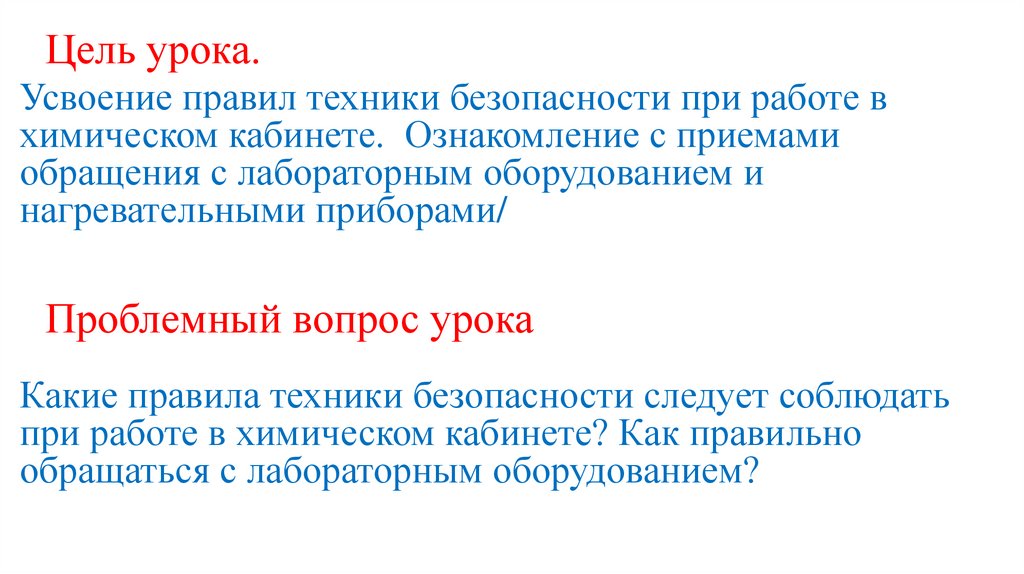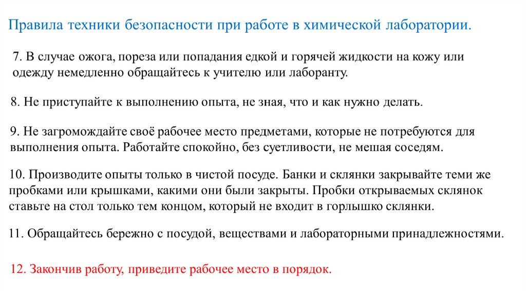 Правила техники безопасности при работе в химической лаборатории.1. Проводите опыты лишь с теми веществами, которые указаны учителем. Не берите