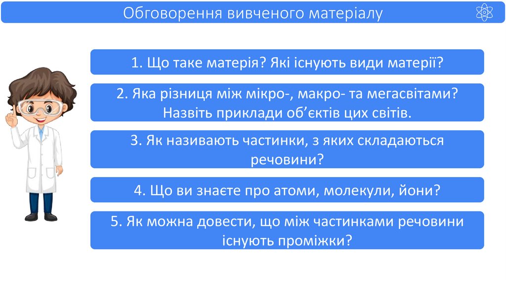 Обговорення вивченого матеріалу1. Що таке матерія? Які існують види матерії?