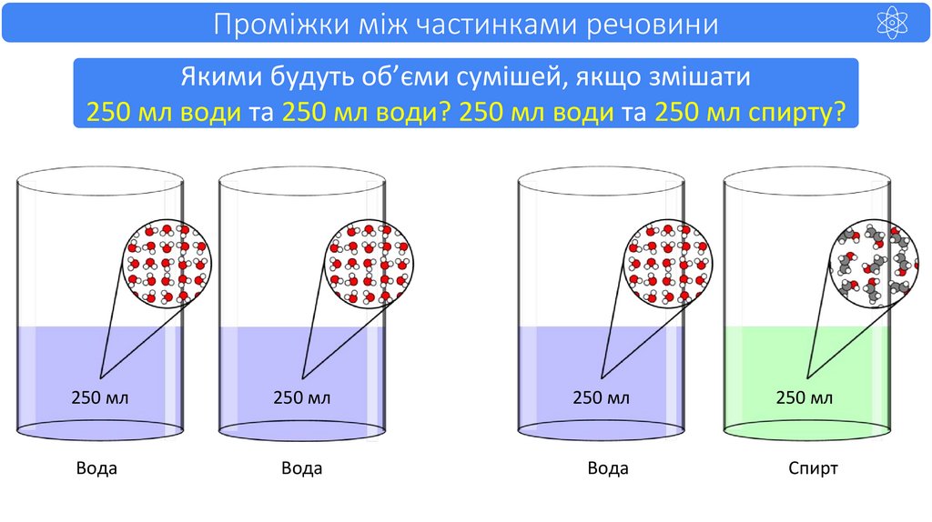 Проміжки між частинками речовиниЯкими будуть об’єми сумішей, якщо змішати