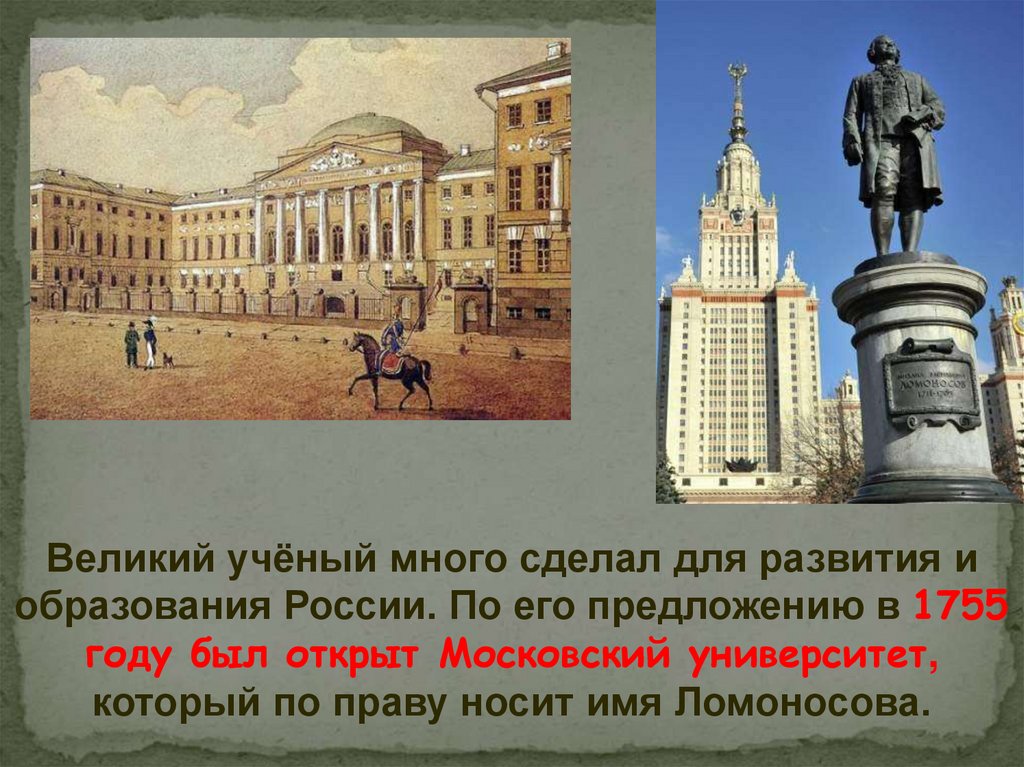 Великий учёный много сделал для развития иобразования России. По его предложению в 1755