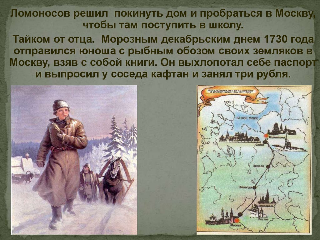 Ломоносов решил покинуть дом и пробраться в Москву,чтобы там поступить в школу.