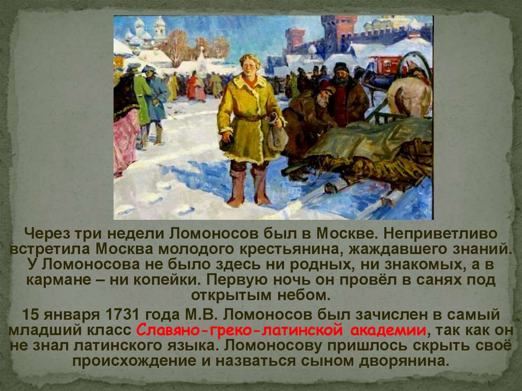 Через три недели Ломоносов был в Москве. Неприветливовстретила Москва молодого крестьянина, жаждавшего знаний.