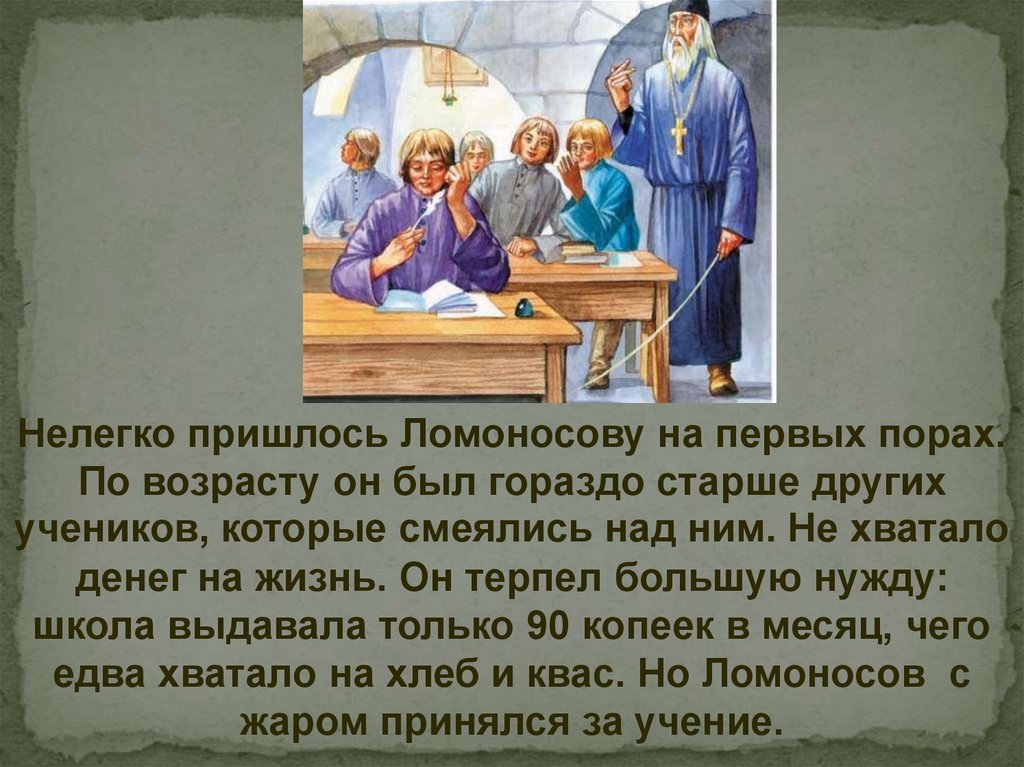 Нелегко пришлось Ломоносову на первых порах.По возрасту он был гораздо старше других