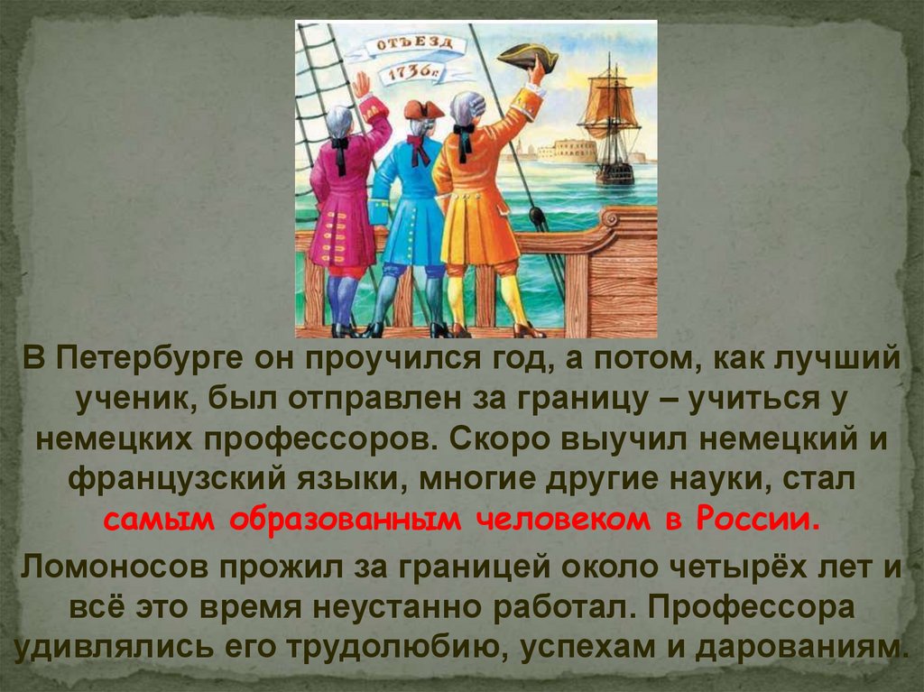 В 1735 году Ломоносова, как одного из лучшихучеников, отправили на учёбу в Петербург в