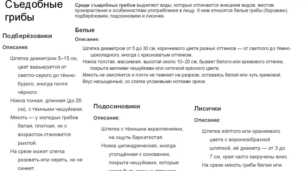 произрастания и особенностями употребления в пищу. К ним относятся белые грибы (боровики),
