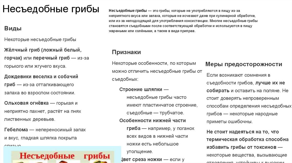 или из-за неподходящей для употребления консистенции. Многие несъедобные грибы