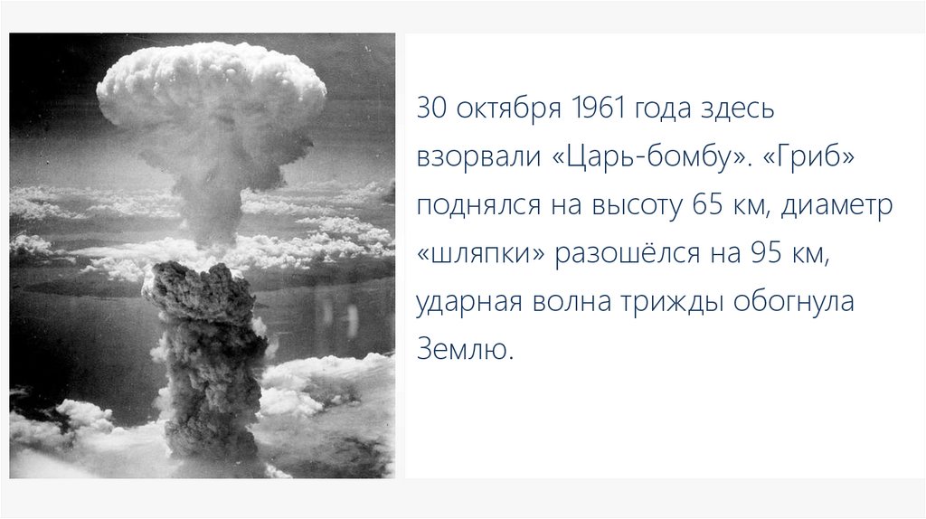 30 октября 1961 года здесьвзорвали «Царь-бомбу». «Гриб»