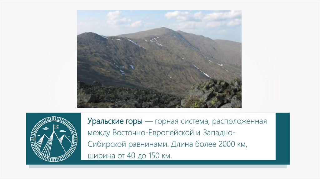 Уральские горы — горная система, расположеннаямежду Восточно-Европейской и ЗападноСибирской равнинами. Длина более 2000 км,