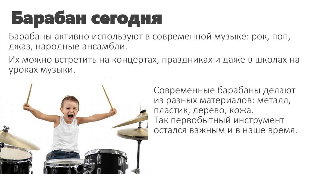 Барабан сегодняБарабаны активно используют в современной музыке: рок, поп,