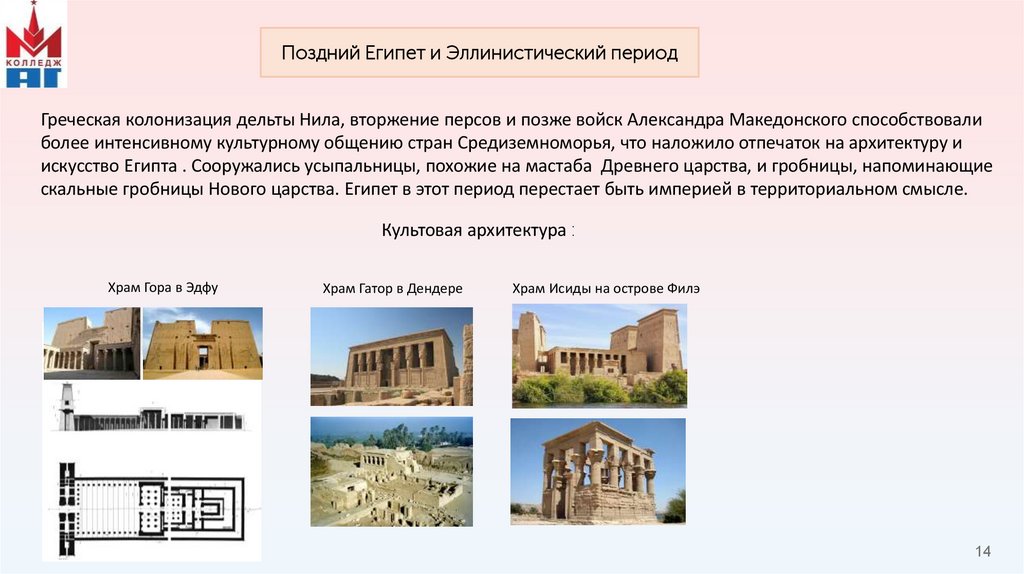 Поздний Египет и Эллинистический периодГреческая колонизация дельты Нила, вторжение персов и позже войск Александра Македонского способствовали