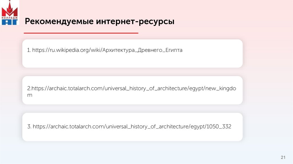 Рекомендуемые интернет-ресурсы1. https://ru.wikipedia.org/wiki/Архитектура_Древнего_Египта