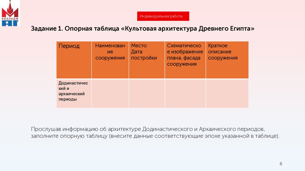 Индивидуальная работаЗадание. Опорная таблица «Культовая архитектура Древнего Египта»