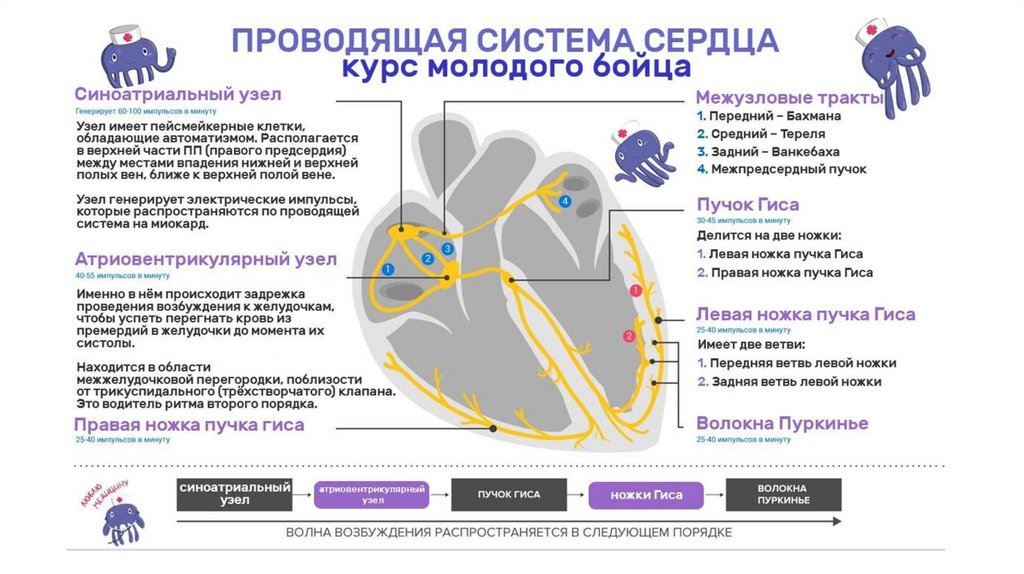 • Проводящая система сердца обеспечивает координированноесокращение камер сердца благодаря способности к генерации