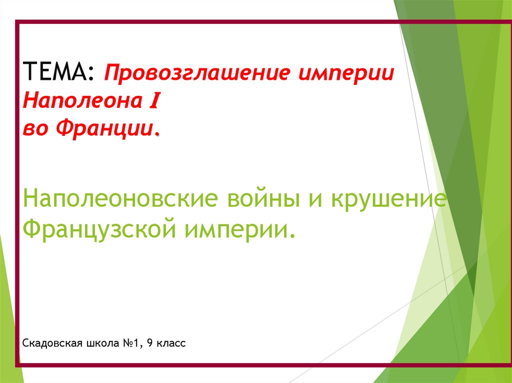 1. ТЕМА: Провозглашение империи Наполеона I во Франции. Наполеоновские войны и крушение Французской империи. Скадовская школа №1,