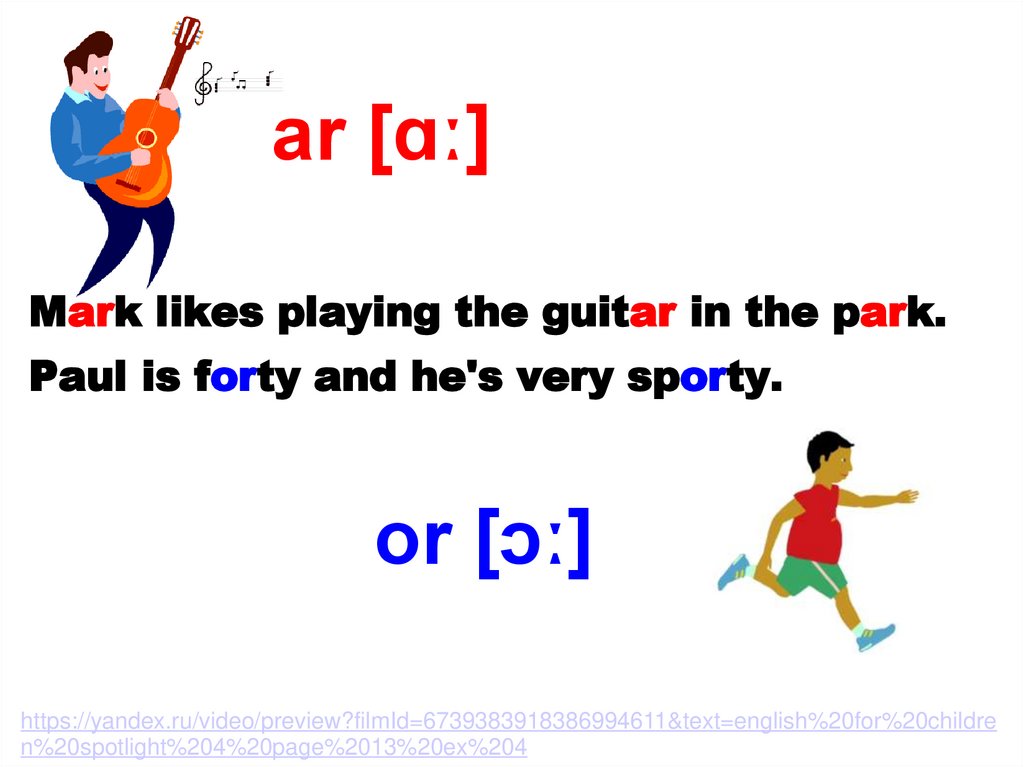 ar [ɑː]Mark likes playing the guitar in the park.