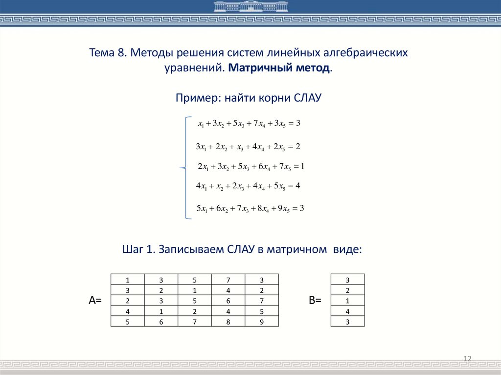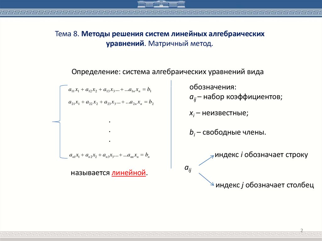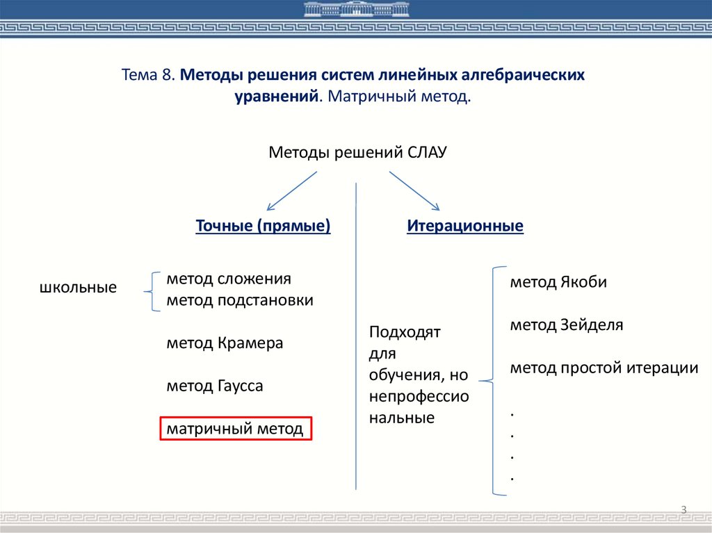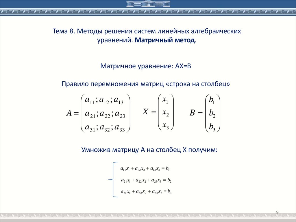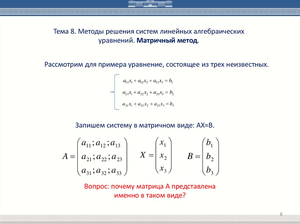 Тема 8. Методы решения систем линейных алгебраическихуравнений. Матричный метод.