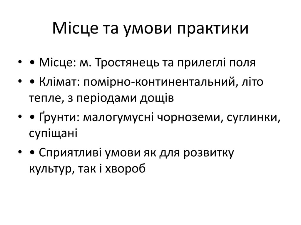 Місце та умови практики• • Місце: м. Тростянець та прилеглі поля