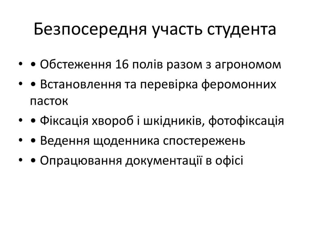 Безпосередня участь студента• • Обстеження 16 полів разом з агрономом