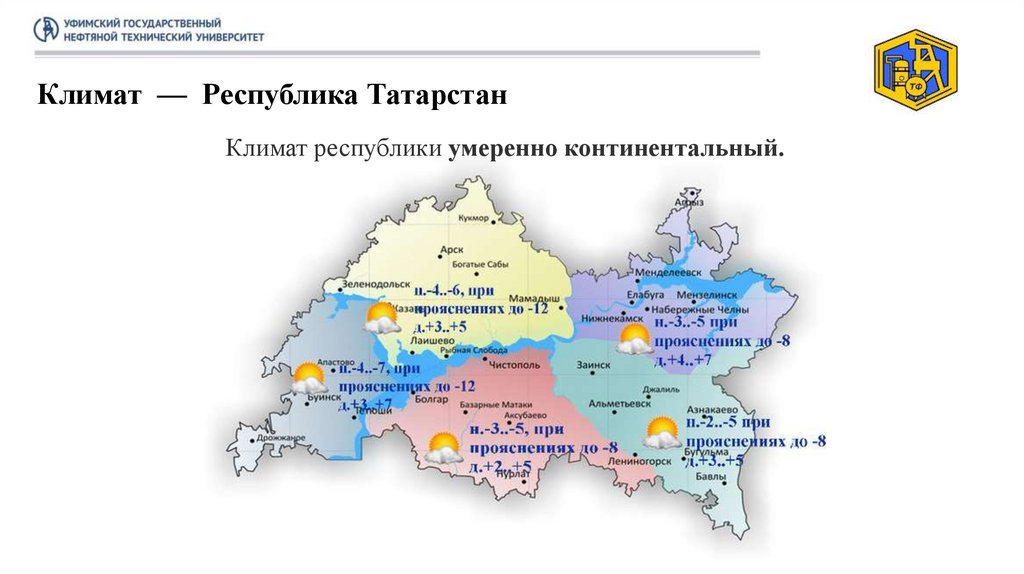 Климат — Республика ТатарстанКлимат республики умеренно континентальный.
