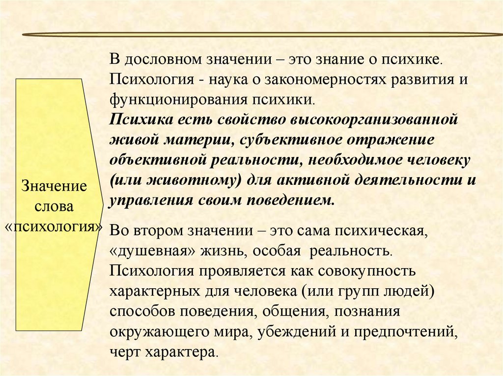 В дословном значении – это знание о психике.Психология - наука о закономерностях развития и