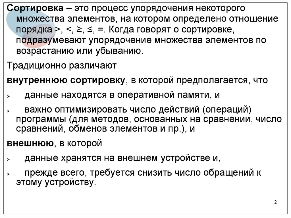 Сортировка – это процесс упорядочения некоторогомножества элементов, на котором определено отношение