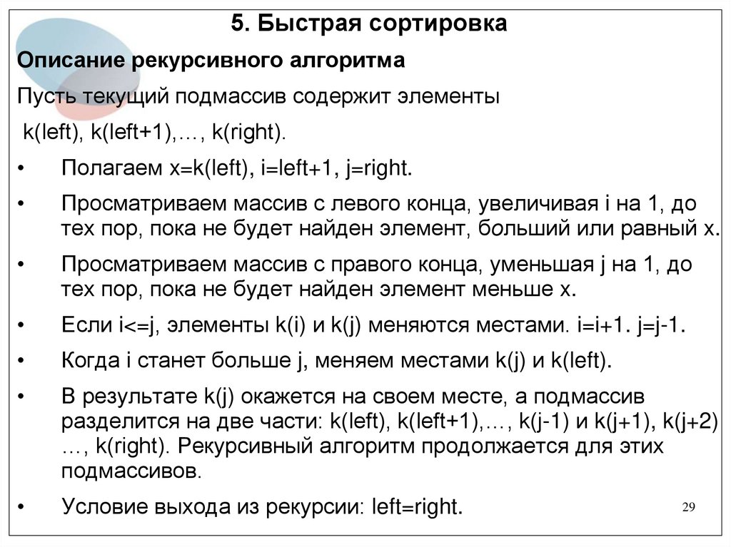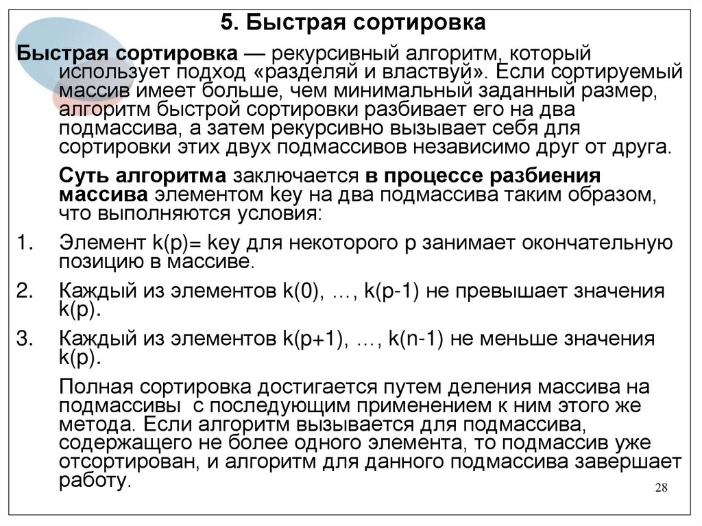 5. Быстрая сортировкаОсобенности алгоритма быстрой сортировки