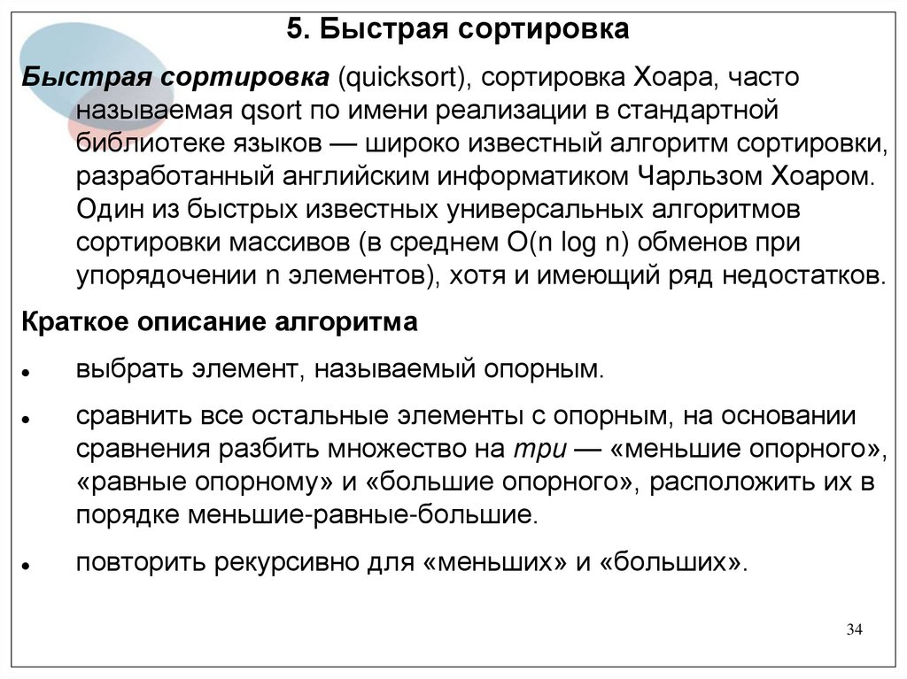 5. Быстрая сортировкаБыстрая сортировка (quicksort), сортировка Хоара, часто