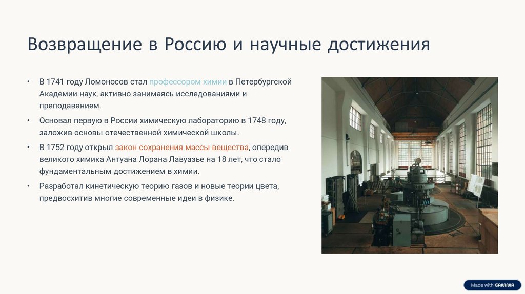 Возвращение в Россию и научные достиженияВ 1741 году Ломоносов стал профессором химии в Петербургской