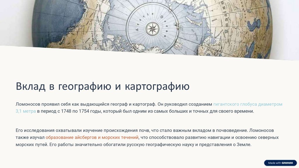 Вклад в географию и картографиюЛомоносов проявил себя как выдающийся географ и картограф. Он руководил созданием гигантского глобуса диаметром