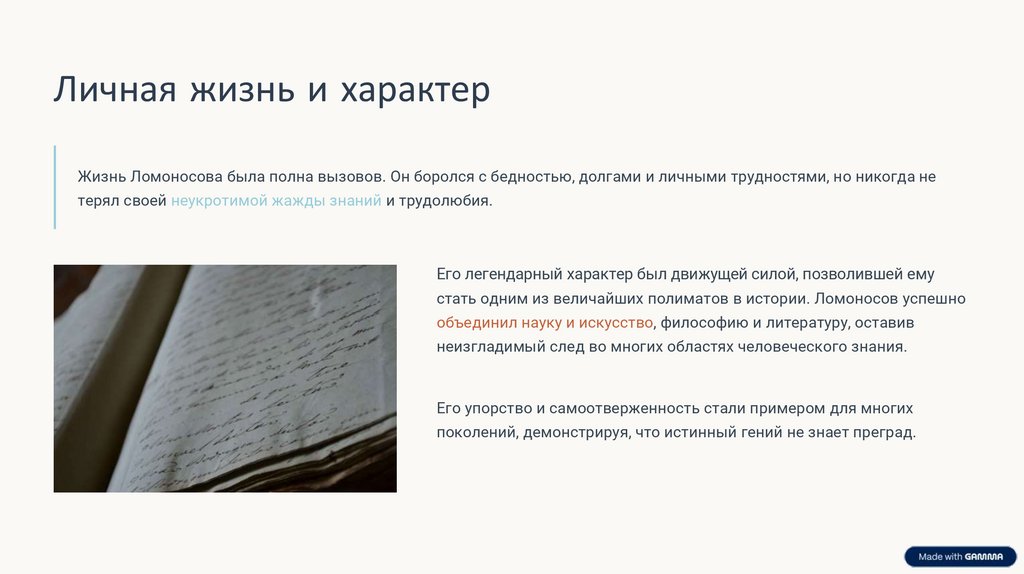 Личная жизнь и характерЖизнь Ломоносова была полна вызовов. Он боролся с бедностью, долгами и личными трудностями, но никогда не