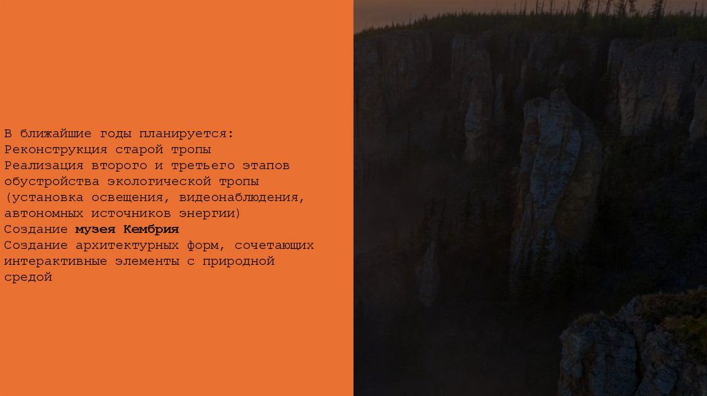 В ближайшие годы планируется:Реконструкция старой тропы