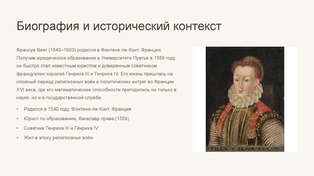 Биография и исторический контекстФрансуа Виет (1540–1603) родился в Фонтене-ле-Конт, Франция.