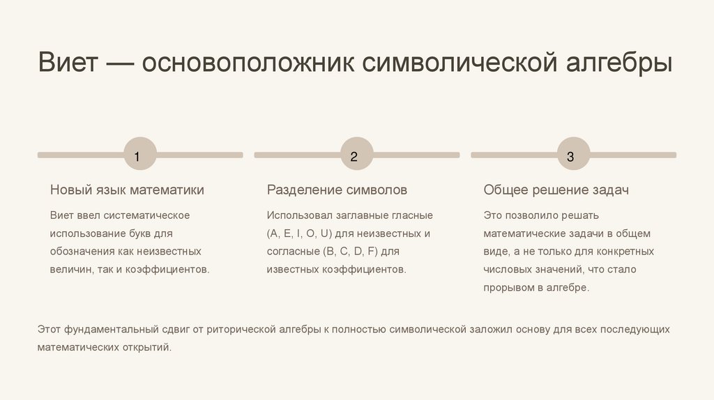 Этот фундаментальный сдвиг от риторической алгебры к полностью символической заложил основу для всех последующих